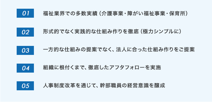 弊社では、実務を通して研究に研究を重ねながら福祉版人事コンサルティングを実践しております。